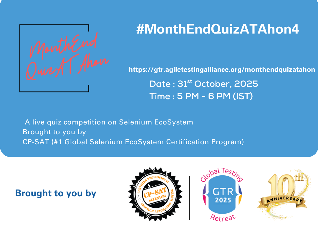 Agile Testing Alliance also provide is providing trainings on SSISFor corporate enquiries:Get in touch with usAgile Testing Alliance is providing ServiceNow Training in the area of HRSD,CSFor corporate enquiries:Get in touch with usAgile Testing Alliance is providing training on DevOpsFor corporate enquiries:Get in touch with usAgile Testing Alliance is providing training on API Testing / WebServices TestingFor corporate enquiries:Get in touch with us UPCOMING EVENTS #MonthEndQuizATAhon431 October 2025 Online #ATAGTR2025Register Now22 & 23 Nov 2025 (Virtual)14 Dec 2025 (Physical) Training on SSISGet in touch with us Online ServiceNow TrainingGet in touch with us Online Training on DevOpsGet in touch with us Online Training on API Testing / WebServices Testing Get in touch with us Online